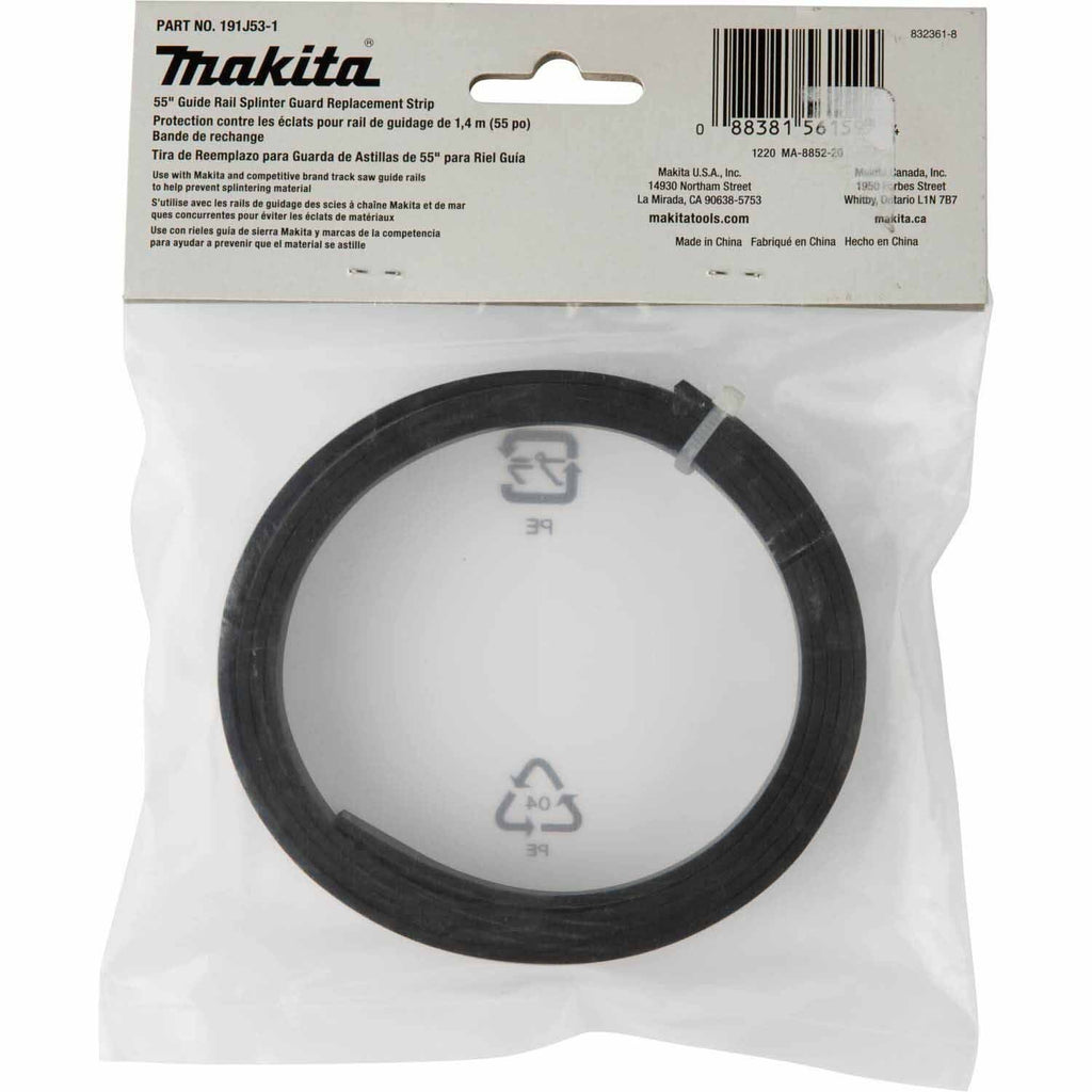 The Makita Splinter Guard Replacement Strip (191J53-1) is 55" long. The strip helps prevent splintering of work material, when used with the guide rail and Corded and Cordless 6-1/2" Plunge Circular Saws. The replacement strip is to be used on Makita Guide Rails (part #199140-0, 194368-5, 194367-7), and is engineered for quick installation.