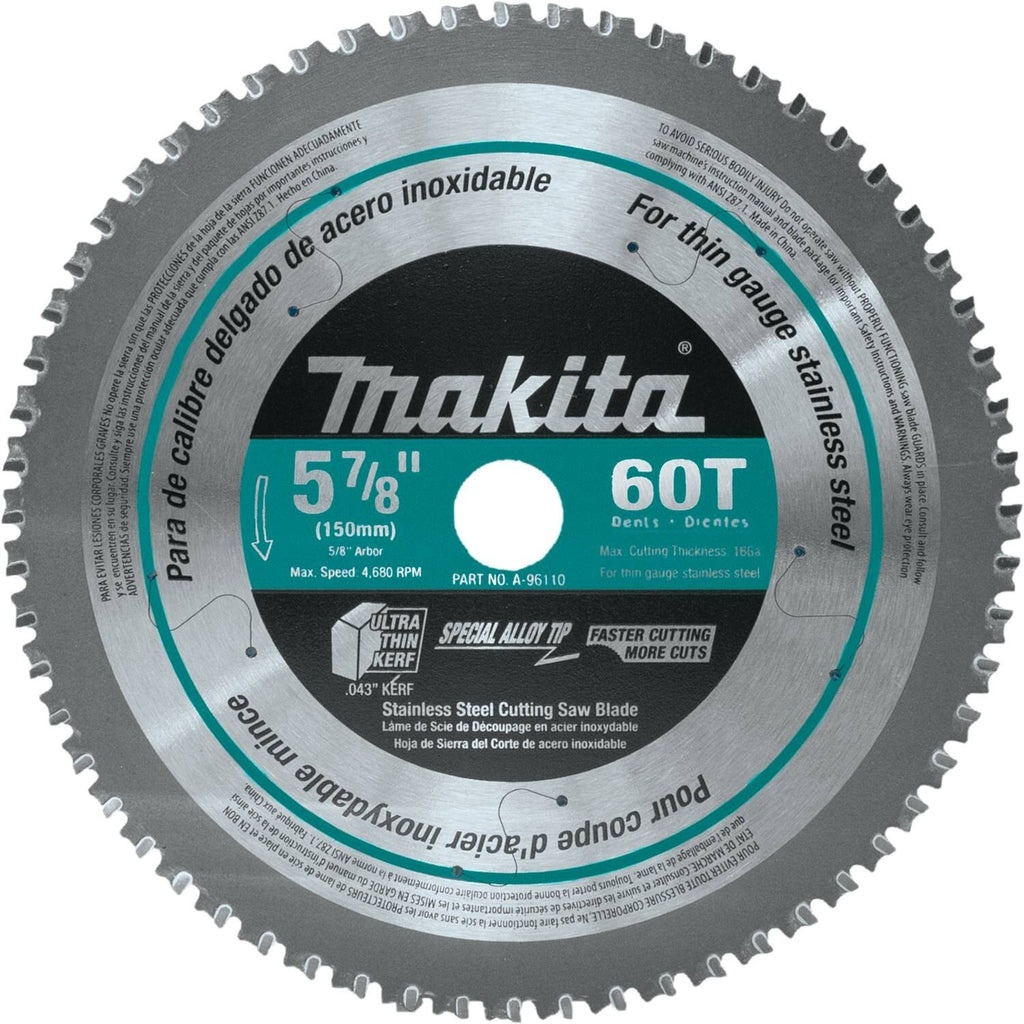The Makita 5-7/8" Carbide-Tipped Metal Cutting Saw Blade is the ideal accessory for the Makita 18V LXT® Lithium-Ion 5-7/8" Cordless Metal Cutting Saw (sold separately). The Makita Metal Cutting Saw Blade has an ultra-thin kerf design that provides smoother cuts with less drag on the motor and minimal material loss. It is ideal for cutting pipe, angle iron, channel, and more.