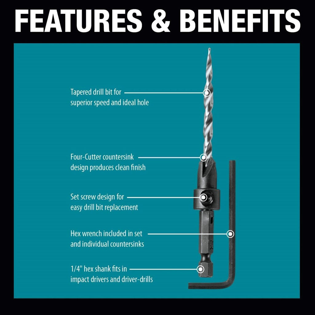 Makita has a deep line-up of drilling, driving and fastening tools and accessories. The Makita 3-Piece Countersink with Drill Bit Set with Hex Wrench (A-99661) is engineered for drilling pilot hole, countersinks and counterbores in one easy operation. The drill bit can be adjusted the desired drilling depth, and the 1/4”’ hex shank fits in impact drivers and driver-drills. The 3-Piece set includes #6, #8 and #10 countersinks plus a hex wrench.