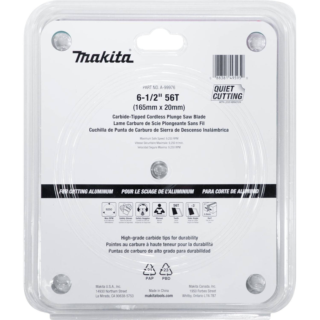 The Makita 56T carbide-tipped saw blade is the ideal accessory for the Makita 6-1/2 In. plunge circular saw (model XPS01, sold separately). With the XPS01, the A-99976 is an ideal blade for cutting aluminum applications. The blade features high-grade carbide tips for improved durability, and is engineered for smoother cutting.