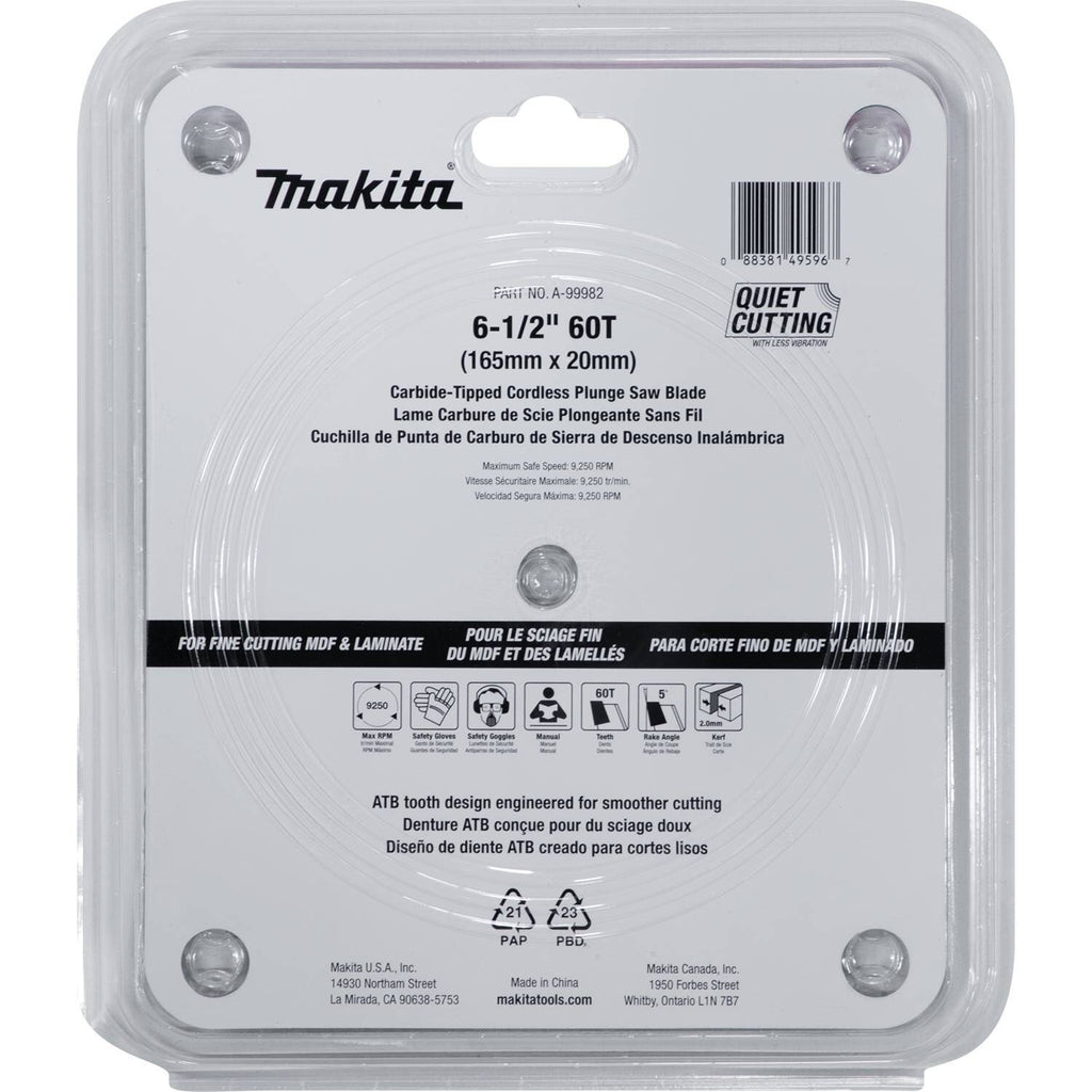 The Makita 60T carbide-tipped saw blade is the ideal accessory for the Makita 6-1/2 In. plunge circular saw (model XPS01, sold separately). With the XPS01, the A-99982 is an ideal blade for cutting MDF. The blade features high-grade carbide Hi-ATB tips for improved durability, and is engineered for smoother cutting.
