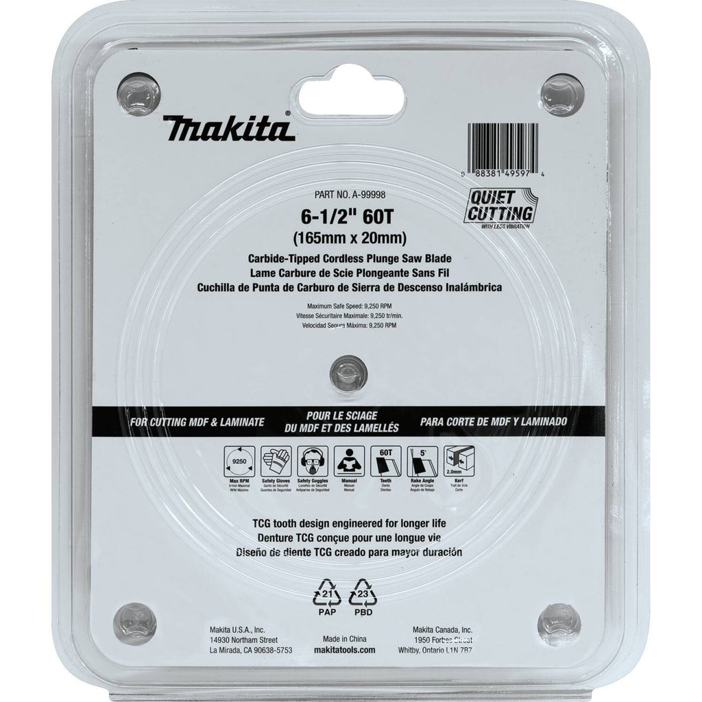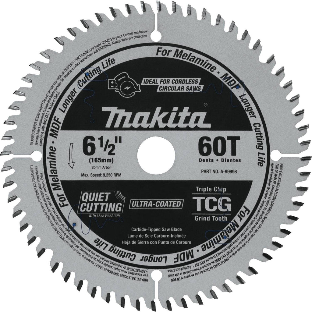 The Makita 60T carbide-tipped saw blade is the ideal accessory for the Makita 6-1/2 In. plunge circular saw (model XPS01, sold separately). With the XPS01, the A-99998 is an ideal blade for cutting MDF. The blade features high-grade carbide TCG tips for improved durability, and is engineered for smoother cutting.