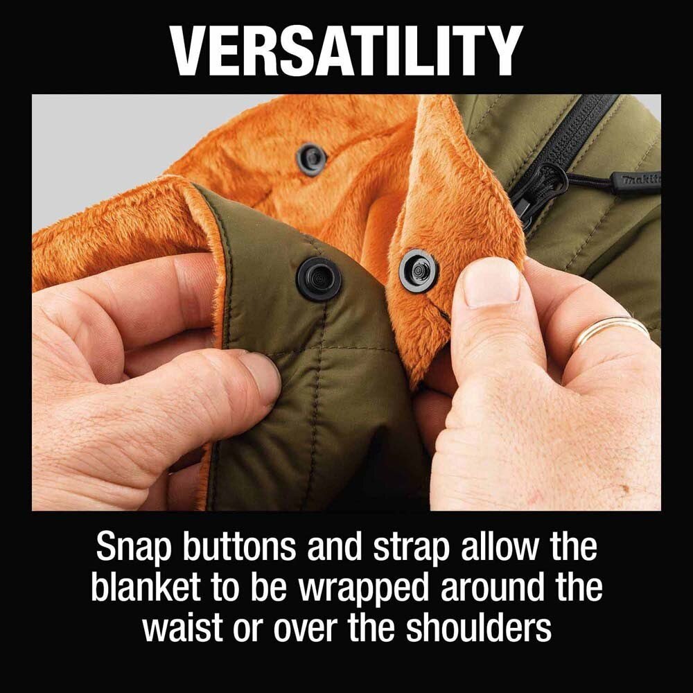 Get outside with Outdoor Adventure™ a new series of cordless products that operate within the LXT® system. Outdoor Adventure Products feature advanced technology, delivering maximum performance and efficiency for the outdoors. Makita offers hundreds of products within the 18V LXT® system so you can create your own adventure. The Makita Outdoor Adventure™ 18V LXT® Heated Blanket (ADCB200B) features three heat settings (high/medium/low) for precise heating control. It offers up to 35 hours of run time on low setting with a fully charged 18V LXT® 6.0Ah battery (battery sold separately). The Outdoor Adventure® Heated Blanket will keep you warm in the outdoors. Convenience features include snap buttons and a strap that allow the blanket to be wrapped around the waist or over the shoulders for wearable options. It also features a storage bag for convenient carrying and is both washer and dryer safe. It’s part of Makita’s expanding 18V LXT System, the world’s largest cordless tool system powered by 18V lithium-ion slide-style batteries. Makita® 18V LXT® Lithium-Ion Batteries have the fastest charge times in their categories, so they spend more time working and less time sitting on the charger.