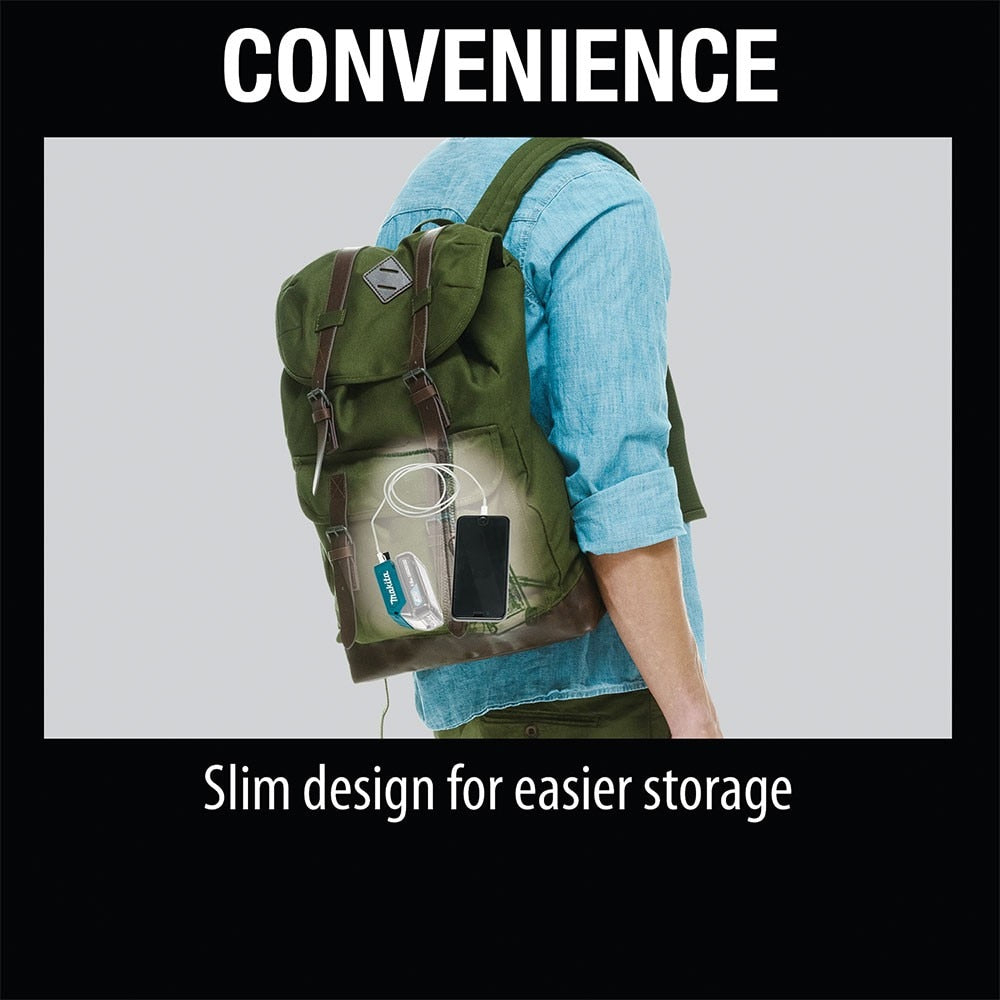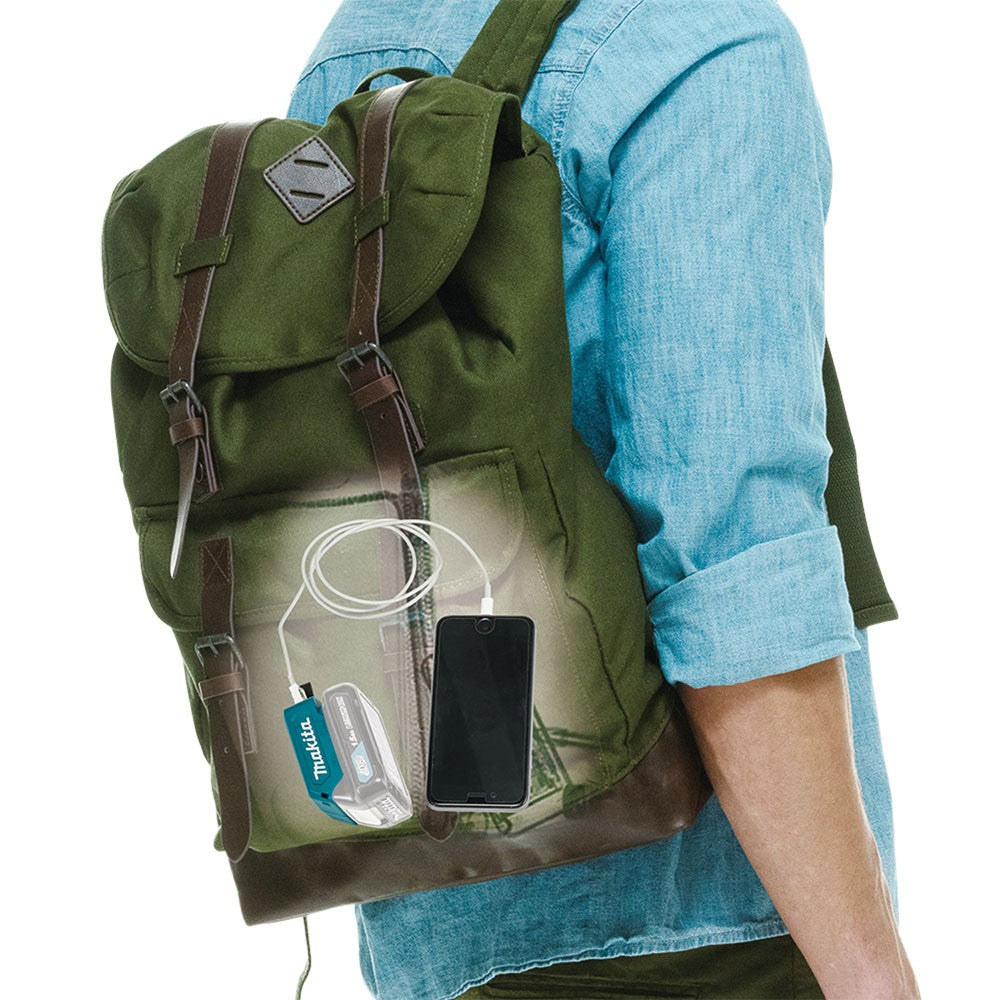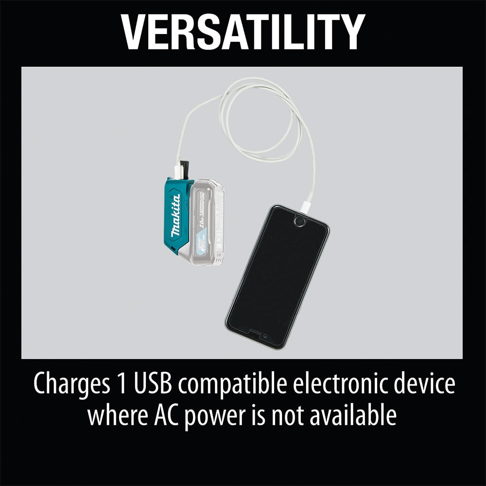 Turn your Makita lithium-ion battery (sold separately) into a charging port with the 12V max CXT Lithium-Ion Cordless Power Source. Mount the ADP08 on to your compatible Makita lithium-ion battery and you get a USB charging port. The USB port delivers 2.1A output, and includes an On-Off switch that activates or deactivates power output. The built-in clip attaches to a belt or holster, with rubber covers for improved durability.