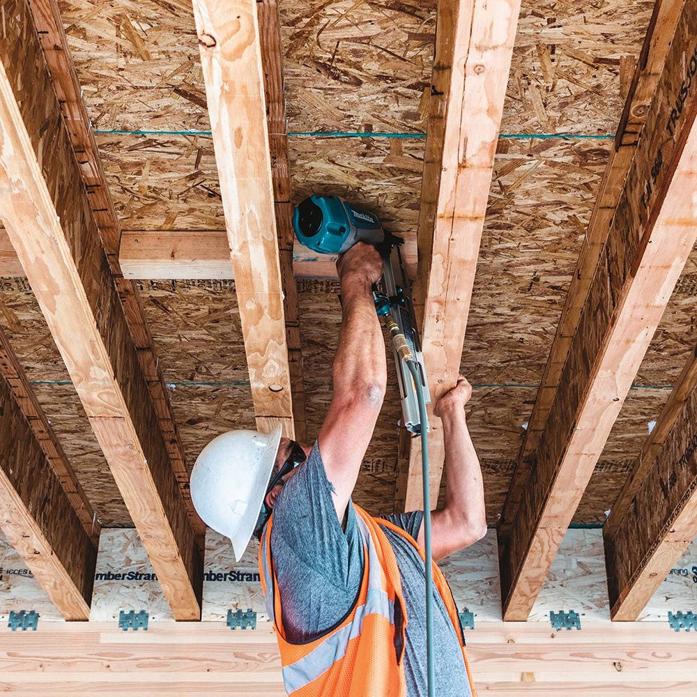 The Makita 3-1/2 In. framing nailer (model AN924) combines durable construction and robust performance with ease-of-use features for commercial framing applications. The AN924 is engineered for a range of applications including framing walls, floors, and roofs, construction of sub-flooring, roof and floor decking, floor and wall sheathing/siding. It is ideal for framers, roofers and carpenters. The AN924 accepts full round-head nails, 2 In. to 3-1/2 In., with up to .148 In. (16d) shank diameter, and the 2-mode selector switch (bump, sequential) provides increased convenience. The AN924 is engineered for longer tool life and ease-of-use, with a built-in air filter to minimize dust and debris from entering. Additional features include an anti-dry mechanism that stops the tool when three nails remain in the magazine, a solid rear-loading aluminum magazine for longer service life, and rubber hand-grips to provide more comfortable handling.