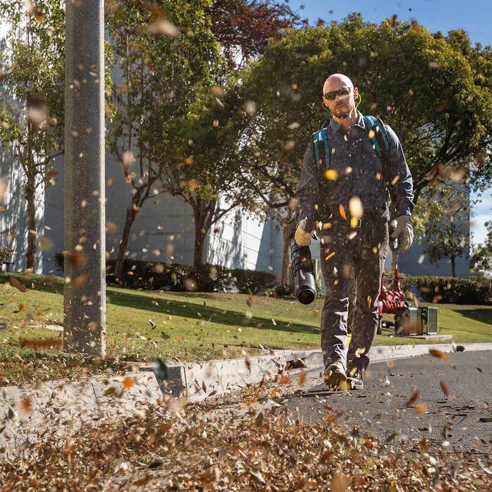 Landscapers are demanding more cordless alternatives to gas-powered outdoor power equipment. Makita is meeting demand with an expanding collection of blowers, including the 40V ConnectX™ Brushless Backpack Blower (CBU02). With zero emissions, lower noise, and considerably less maintenance than gas-powered models, this Backpack Blower is a welcome solution for landscapers. A Makita-built brushless motor delivers the power of a 64cc backpack blower. The Backpack Blower delivers a high blowing force of 22 Newtons to handle heavy debris. It has a tube-mounted variable speed trigger that adjusts between 0 - 671 CFM for power and run time management. There is a cruise control lever speed lock-on variable speed trigger for comfortable continuous operation. It has a sound pressure rating of 60 dB(A); measured per ANSI B 175.2 standard The nozzle features a downward endpoint to reduce arm fatigue and provide powerful airflow. It telescopes to 3 stages. The in-line fan design provides better tool balance and improved ergonomics. The CBU02 can deliver over 4 hours of runtime with the ConnectX™ 1,200Wh Portable Backpack Power Supply (model number PDC1200A01, power supply sold separately). Convenience features include a power button on the control handle that allows the user to start the Backpack Blower while wearing it. There is a tool-less control handle adjustment for user convenience. The handle features a rubberized soft grip that provides increased comfort on the job. It features an adjustable ergonomic harness with waist belt for operator comfort. For added user convenience there is an integrated carry handle for transportation and hanging storage, as well as a durable housing with base that allows the backpack blower to stand upright. The Blower features IPX4 weather-resistant construction and exclusive Extreme Protection Technology (XPT™). XPT is a protective seal inside the tool and is engineered for improved operation in harsh conditions by channeling water and dust from key internal components.