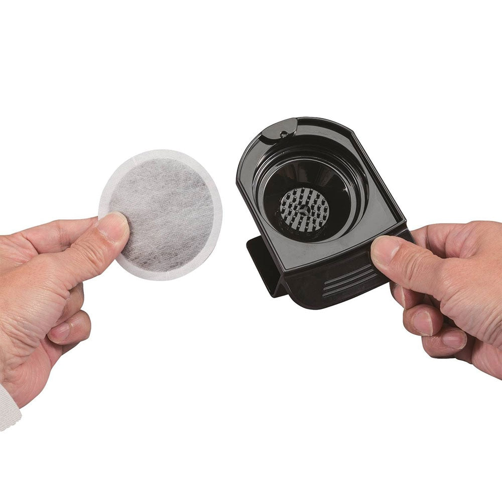 - No paper filters needed; permanent drip filter allows grounds to be poured directly into coffee maker