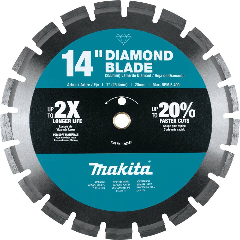 Makita Diamond Blades are designed to be used with power cut saws for making cuts in a variety of masonry materials. The high quality steel core is expertly tensioned for true cuts and added durability. Each blade features the highest quality diamonds, and the segments are laser welded for added durability and improved cutting efficiency. The E-02587 is ideal for making cuts in soft materials including asphalt and green concrete.