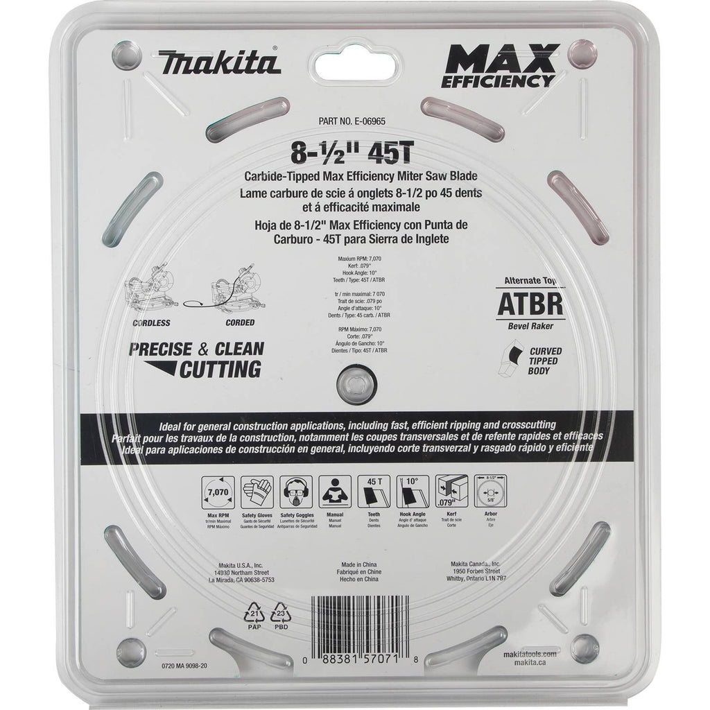 The Makita® 8-1/2" 45T Carbide-Tipped Max Efficiency Miter Saw Blade is the ideal accessory for Makita® Cordless Miter Saws (sold separately). Max Efficiency accessories are engineered to deliver optimal run times and performance. Get up to 60% more cuts per charge and up to 90% faster cutting compared to standard blades. The Max Efficiency Circular Saw Blade has an ultra-thin kerf design that provides smoother cuts with less drag on the motor and minimal material loss. Featuring special ATAFR (Alternate Top Alternate Face w/Raker) carbide tips, the saw blade can provide smoother and faster cuts. The blade is expertly tensioned for precision and true cutting. It is ideal for fine crosscutting applications.