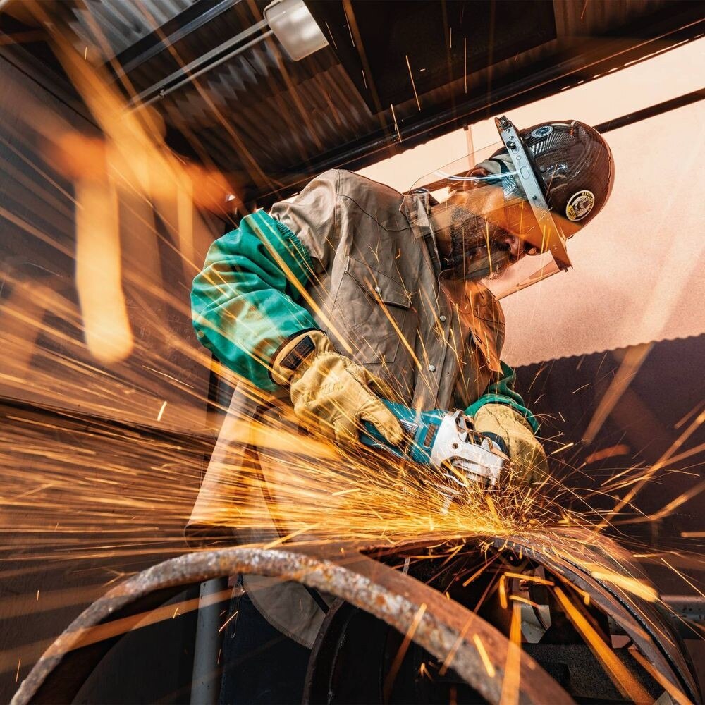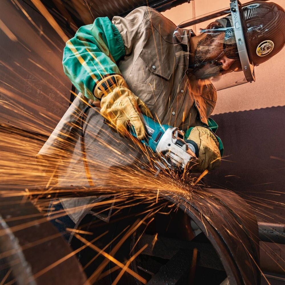 The Makita 4-1/2" SJS™II High-Power Angle Grinder, Paddle Switch (GA4595) features a powerful 15 AMP motor that delivers more output and 11,500 RPM. The High-Power Angle Grinder features SJS™II, which uses a leaf spring and cam gear drive mechanism that is engineered to reduce vibration for increased operator comfort during extended use. Vibration is further reduced by the vibration absorbing side handle which provides increased comfort on the job. The GA4595 features an Electronic Controller that provides soft start, which is designed to suppress start-up reaction for smooth start-ups and longer gear life. The High-Power grinder features labyrinth construction seals and protects the motor and bearings from dust and debris for longer tool life. The motor fan is designed with enlarged fins for increased air flow and a cooler running motor. The GA4595 features spiral bevel gears for smoother rotations and a more efficient transfer of energy. It features a fully aluminum constructed gear housing which provides superior gear alignment and smooth transmission for increased durability and comfort. An Electronic Controller provides an electronic current limiter which helps protect the motor from overload in high torque applications. Convenience features include a “tool-less" wheel guard for easy adjustment, and a paddle switch with lock-on for continuous use.
