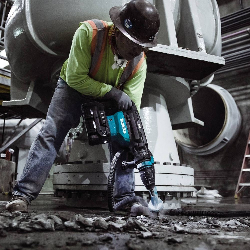 • The 80V max (40V max X2) XGT® Brushless 28 lb. Demolition Hammer Kit (GMH02PM) is a cordless concrete solution designed for heavy-load applications. It delivers the power, speed, and run-time for corded demands, without the cord. The demolition hammer delivers up to 15% faster breaking than equivalent corded hammer (HM1213C). It accepts SDS-MAX bits. Anti-Vibration Technology (AVT®) for reduced vibration. More than just a padded handle, AVT is an internal counterbalance that uses air pressure to move counterweight pistons in the opposite direction of the drive piston to actively reduce vibration. For added durability in harsh job site conditions, Extreme Protection Technology (XPT™) is engineered for improved dust and water resistance. Auto-Start Wireless System (AWS®) uses Bluetooth® technology for wireless power-on and power-off communication between the equipped tool and dust extractor. Once connected via AWS, the AWS-equipped dust extractor will automatically power on or off when the AWS-equipped cordless tool starts or stops, running only when the tool is in use. This increases productivity on a single charge and reduces continuous noise at the job or work site. Constant speed control that automatically applies additional power to the motor to maintain speed under load to complete challenging jobs and a variable speed control dial enables users to match speed to the application. Additional performance features include an electric brake, variable speed dial, built-in L.E.D. light, a soft-start to suppress start-up reaction, and Soft No-load function that automatically reduces the speed of the motor when idling. XGT is a system of equipment, tools, batteries and chargers utilizing 40v max lithium-ion batteries. XGT is engineered to deliver high power to take on high-demand applications, allowing users to completely transition to a cordless job site. XGT is equipped with advanced brushless motor engineering, intelligent digital communication, and superior durability features to outpower, outsmart and outlast the rest.