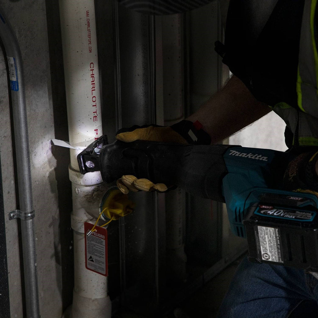 The 40V max XGT® Recipro Saw Kit (GRJ01M1) delivers faster cutting speed for cutting and demolition applications. Makita-built variable 2-speed brushless motor delivers 0-2,300 (low) and 0-3,000 (high) strokes per minute. XGT® technology delivers up to 145 cuts per charge in 2x10 SPF lumber using one XGT 4.0Ah Battery. The XRJ04T is equipped with efficiency features for faster cutting. The long 1-1/4” stroke length increases cutting efficiency, and the refined crank mechanism design minimizes blade deflection and reduces vibration. Convenience features include a large two-finger variable speed trigger, electric brake, built-in L.E.D. light and a tool-less blade change for faster blade installation and removal. Ergonomically designed handle for difficult cutting applications, such as overhead. XGT is a system of equipment, tools, batteries and chargers utilizing 40v max lithium-ion batteries. XGT is engineered to deliver high power to take on high-demand applications, allowing users to completely transition to a cordless job site. XGT is equipped with advanced brushless motor engineering, intelligent digital communication, and superior durability features to outpower, outsmart and outlast the competition.