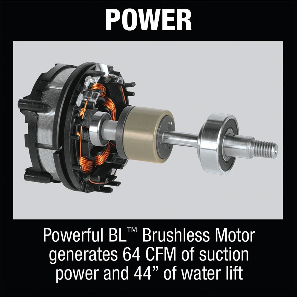 - Powerful BL™ Brushless Motor generates 64 CFM of suction power and 44" of water lift