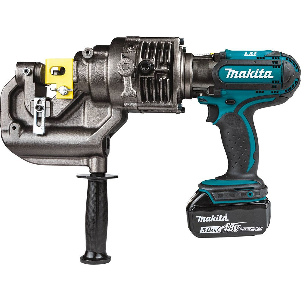 - Makita technology delivers category-leading charge time so the battery spends more time working and less time sitting on the chargerPunch holes in ¼" metal in under 5 seconds with the 18V LXT® Lithium-Ion Cordless 5/16" Hole Puncher Kit (XPP01T1K). The XPP01T1K allows hole punching with complete cordless mobility. It can punch up to 180 20MM (25/32”) diameter holes in 15/64" thick steel with a 5.0Ah 18V LXT Battery. The punch stop mechanism automatically retracts the die once a punch is complete to quickly continue operation. For select applications, hole punching just became fast and effortless! The ergonomic grip handle rotates 360°, allowing for optimal positioning in a variety of spaces. It features a rubberized soft grip for increased comfort on the job and a convenient side handle for additional support. The XPP01T1K is ideal for fabrication, HVAC, plumbing, electrical, mechanical and many more applications. It’s part of Makita’s expanding 18V LXT® System, the world’s largest cordless tool system powered by 18V lithium-ion slide-style batteries. Makita® 18V LXT® Lithium-Ion Batteries have the fastest charge times in their categories, so they spend more time working and less time sitting on the charger. For improved tool performance and extended battery life, Makita created Star Protection Computer Controls™. Star Protection is communication technology that allows the Star Protection-equipped tool and battery to exchange data in real time and monitor conditions during use to protect against overloading, over-discharging and overheating. For increased versatility, the tool can also be powered by Makita® 18V LXT® Lithium-Ion Batteries with the star symbol on the battery indicating Star Protection inside.