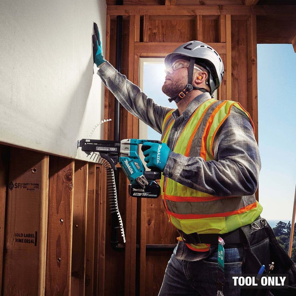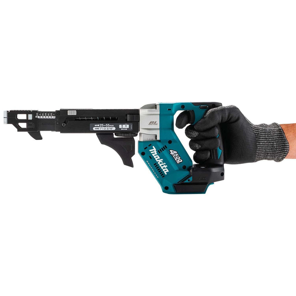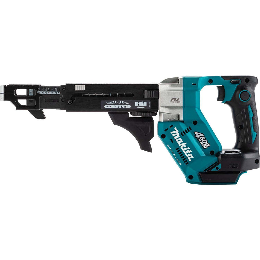 The Makita 18V LXT brushless cordless autofeed screwdriver delivers up to 4,500 RPM for fast fastening in drywall, decking, and framing applications. Push Drive Technology starts the motor only when the fastener engages for improved efficiency, and the tool’s compact 15-5/8 in design supports reduced user fatigue (battery and charger sold separately).