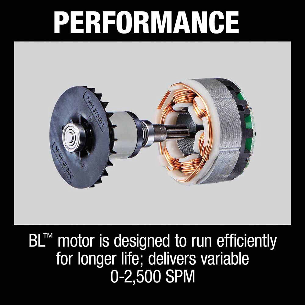 • BL™ Brushless motor is designed to run cooler and more efficiently for longer life; delivers variable 0-3,000 SPM