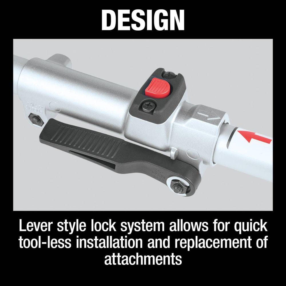 - Lever style lock system allows for quick tool-less installation and replacement of attachments